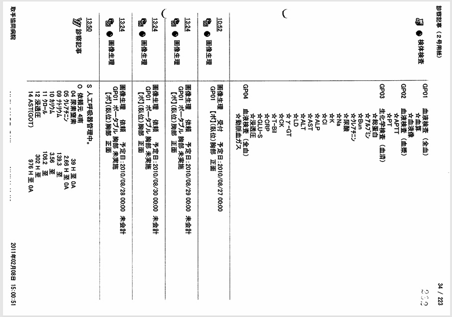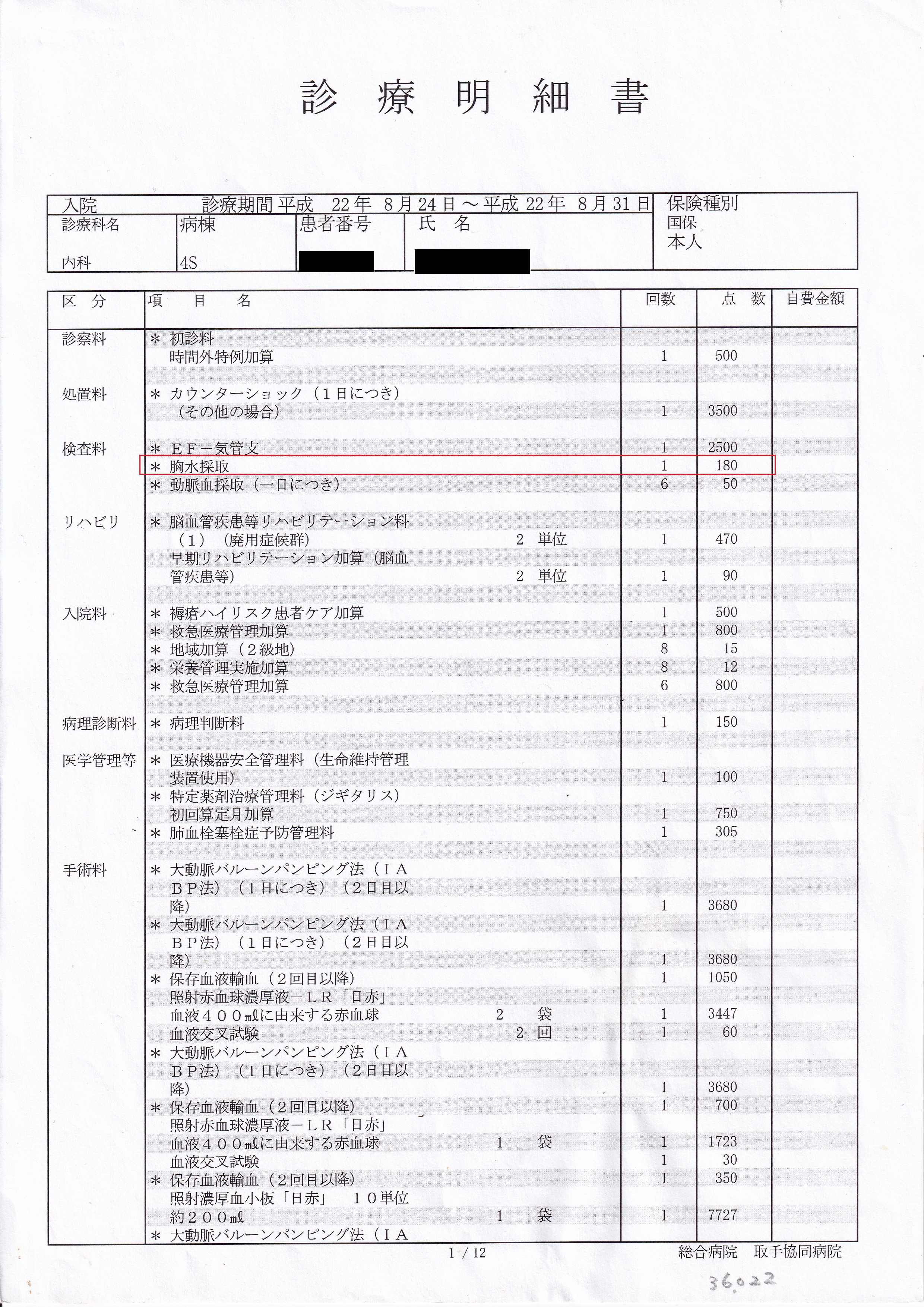 2010年8月分レセプトの検査に「心嚢水」の項目はなく「胸水」のみ。→「心嚢穿刺」という医師説明は虚偽の可能性。