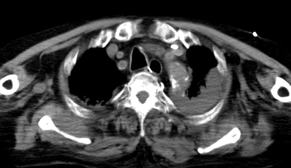 この時、同時に撮影された胸腹部CTでは、大動脈周囲に三日月状の血種様の病変が認められ、両胸腔にはフィブリン化したと思われる血餅の残存病変が多数認められた。大動脈損傷に伴い大動脈から胸腔に出血していた証拠であり、当初のPCI(カテーテル治療)での医療事故の痕跡がこのCT画像に残っている。