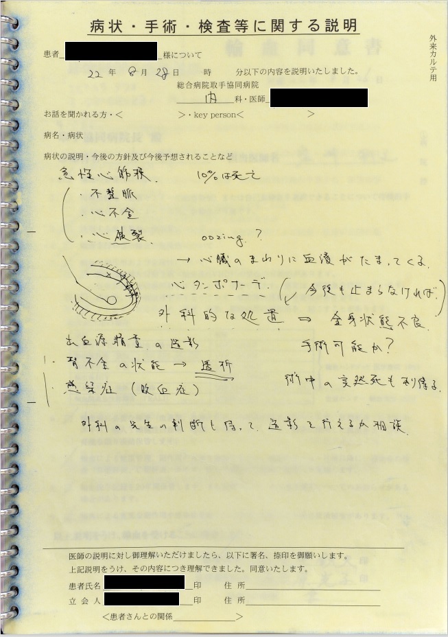 8月28日夜半過ぎにショック解除が行われたが、私たち家族への連絡もなく同意も取得していなかった。 私たち家族への着信記録もなかった。 私が心配になり病院に行くと、8月28日午前9時30分の時点で血圧110/60 mmHg, 心拍数100/minとショックから離脱していた。 医師は「夜間、さらに血圧が下がったため、エコーを当ててみると、心嚢水が貯留して心タンポナーデになっていたため、心嚢穿刺を行った」と私に事後報告した。「その原因はoozing型心破裂と言って、心筋梗塞で壊死して脆くなった心筋の隙間から心嚢内に血液が少しずつ漏れ出している状態であり、いずれにしても危険な状態」とのことであった。