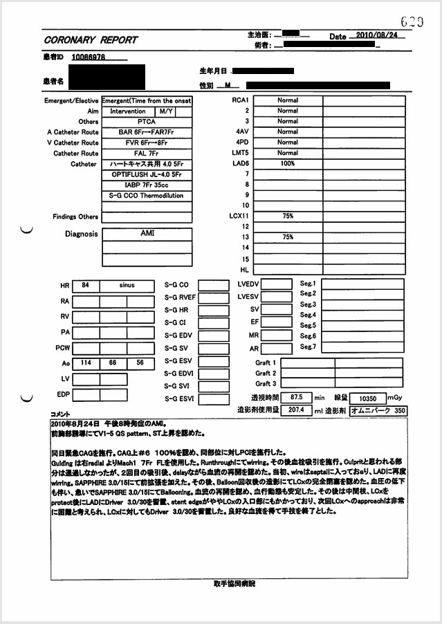 心カテ検査記録によると、PCIでの放射線被曝量は10350mGyに達し、許容量を大幅に超過。