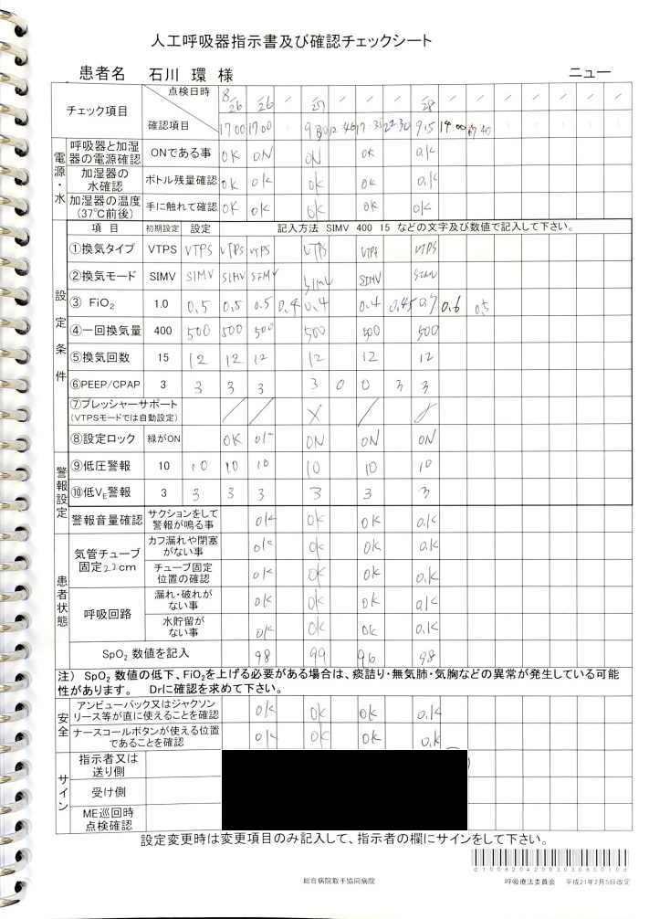 証拠:偽名が記載された人工呼吸器設定記録