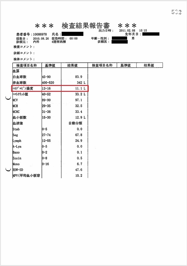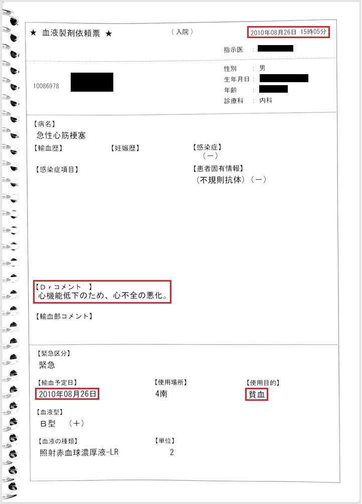 貧血にて輸血開始(カルテ・看護記録に記載あり)。しかし当日の血液検査ではHb 11.1 g/dlと貧血は軽度。 Hb 11.1 g/dlが本当であれば不適切診療。輸血が必要な状態であれば、Hb 11.1 g/dlは虚偽。