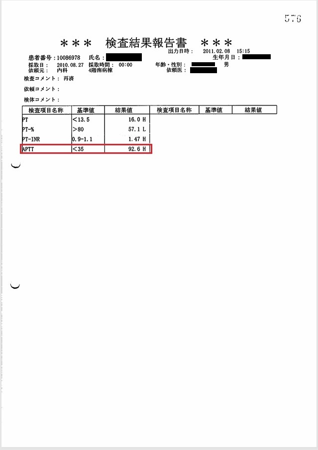 この時、撮影された頭部CTで急性硬膜下血腫が認められた。これが父の直接の死因となった。 医師からもその説明があったが、 直接の原因と推定される「頭部打撲」には一切言及がなく(録音記録あり)、 DIC(播種性血管内凝固)に伴う出血傾向による自然出血とのことだった。 しかしほぼ同時に行われた血液検査では、「PT-INR 1.3, APTT 35 sec, 血小板3.6万/μl」と 出血傾向はごく軽度であり、自然発生的に頭蓋内に出血を起こす可能性は皆無と言ってよい。