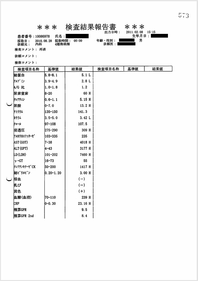 入院した8月25日から8月28日にかけて血液検査で肝機能の値(AST, ALT)、腎機能の値(Cre)が急激に上昇し、肝機能の値のピーク値は8月28日のAST 4018 U/l, ALT 3177 U/lと重度の肝不全であり、経過からはショック肝と考えられる。 また腎機能を示すCreは、8月26日にCre 0.82 mg/dl, 8月27日にCre 2.66 mg/dl, 8月28日にCre 5.15 mg/dlと腎不全が日単位で急激に進行しており、血圧低下の経過と一致しており、ショック腎と考えられる。