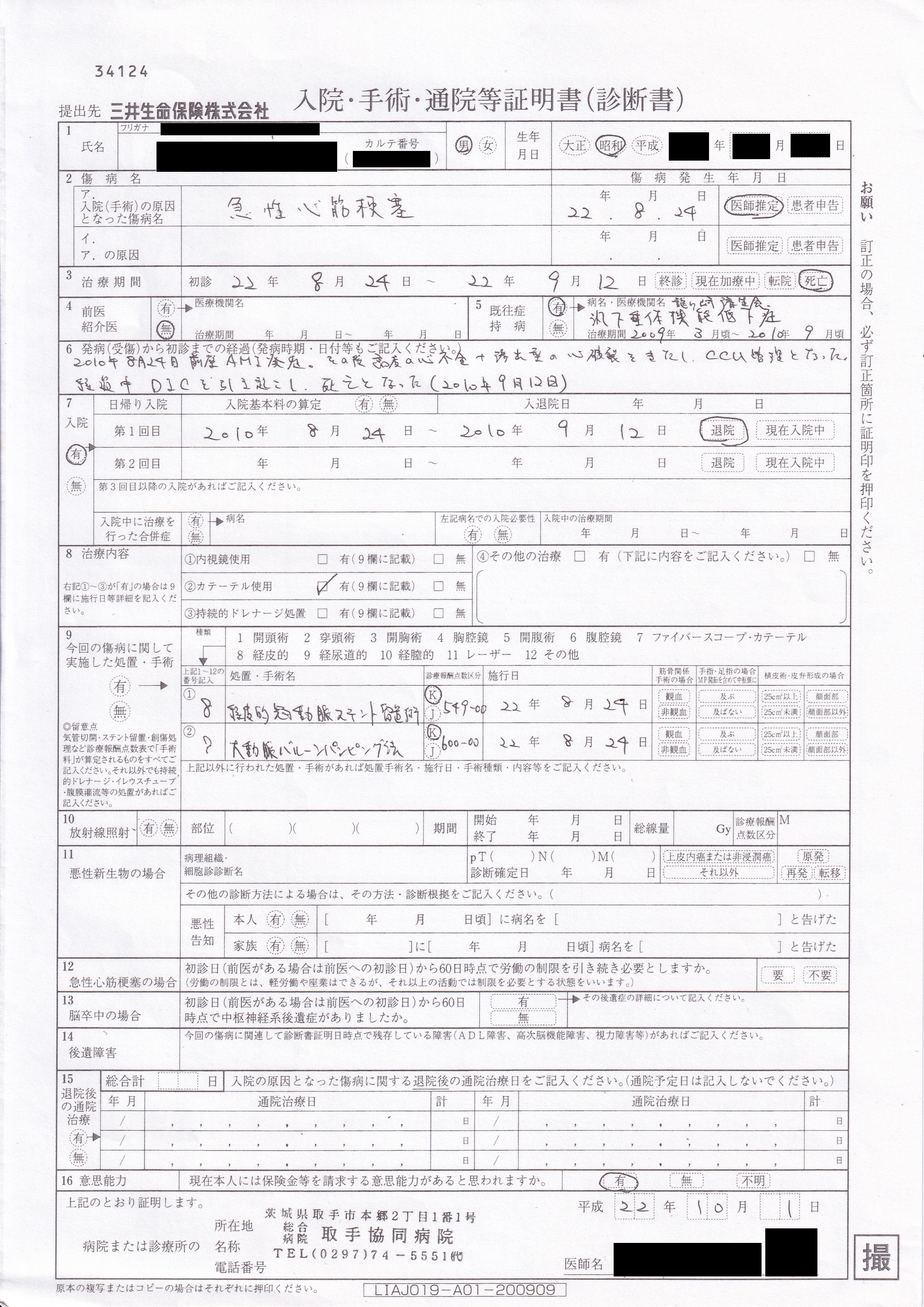 - 生命保険診断書:心嚢穿刺の記載なし